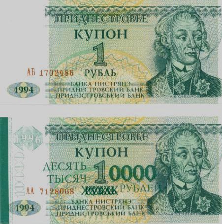 In the early 1990s, the small country of Transdniestria experienced hyperinflation. Instead of printing brand new currency, Transdniestria printed over their old currency. Click on the image below to see a before and after picture. In this situation they printed four zeros on an existing banknote, crossed out some text, and added a new year (it now has both 1994 and 1996). As a result, a "1" became "10,000." (As they say, "Kids, don’t try this at home.")